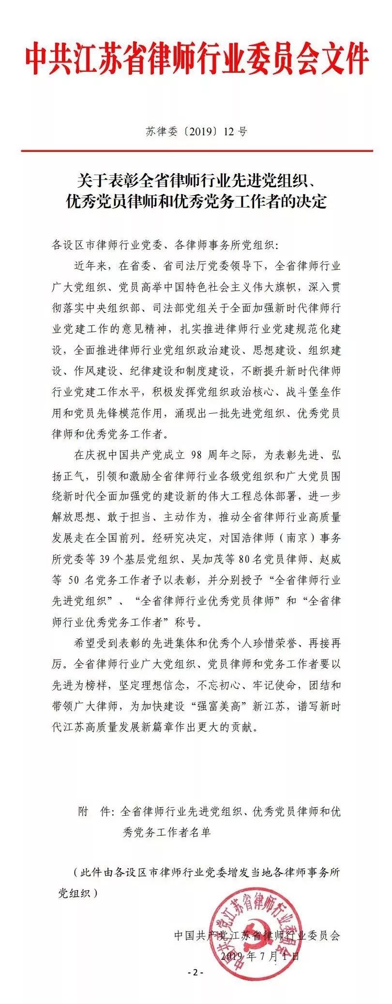 2019年7月1日,中國共產黨成立98周年之際,為表彰先進、弘揚正氣,引領和激勵全省律師行業(yè)各級黨組織和廣大黨員圍繞新時代全面加強黨的建設新的偉大工程總體部署,進一步推動全省律師行業(yè)高質量發(fā)展。江蘇省律師行業(yè)黨委對39個基層黨組織、80名黨員律師、50名黨務工作者予以表彰。