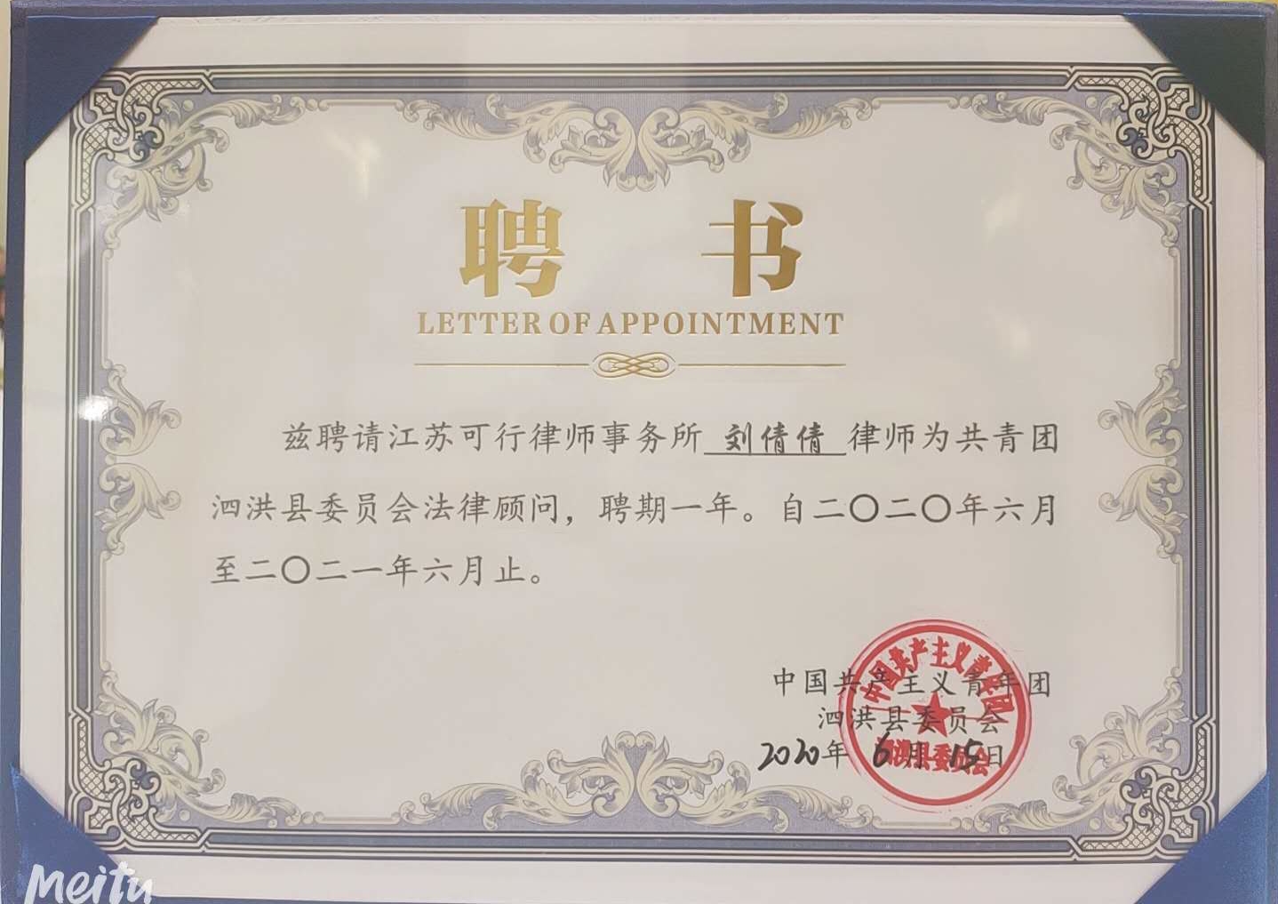 熱烈祝賀我所劉倩倩律師被中國共產主義青年團泗洪縣委員會聘為常年法律顧問